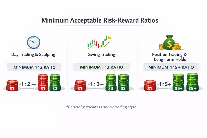 For day trading and scalping, a minimum 1:2 risk-reward ratio is common. The higher frequency of trades and shorter holding periods make this necessary for profitability, given transaction costs.