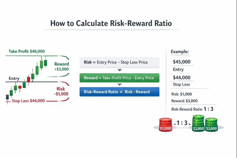 For example, suppose you're buying Bitcoin at $45,000. You set your stop loss at $44,000 (risking $1,000 per BTC) and your take profit at $48,000 (potential gain of $3,000 per BTC). Your risk is $1,000, your reward is $3,000, and your risk-reward ratio is 1:3.