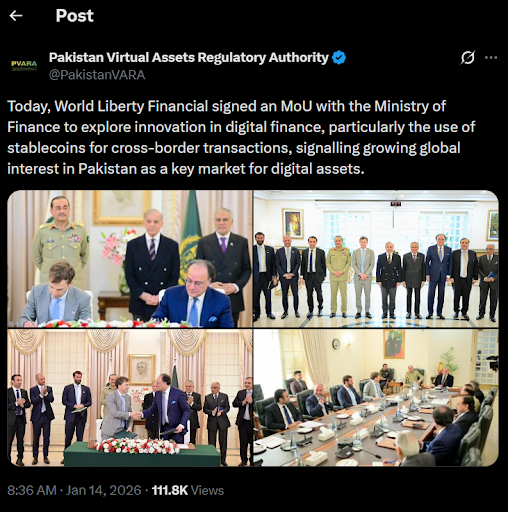 Pakistan's Ministry of Finance signed an agreement to explore using USD1 stablecoins for remittances and trade payments.