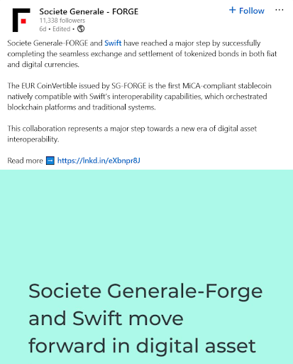 - SWIFT tested euro-denominated stablecoins for settling tokenized bonds, working with Societe Generale-Forge on a system that handles payments and redemptions across both blockchain and traditional banking networks.
