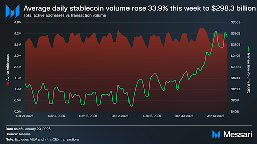 Transaction volumes jumped 33.9% in one week to $298.3 billion daily, though the number of active users fell slightly to 4.08 million.
