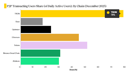 What's more interesting is how people actually use the network. About 78% of Tron's daily users send payments directly to each other, wallet-to-wallet. No other major blockchain comes close to this percentage.