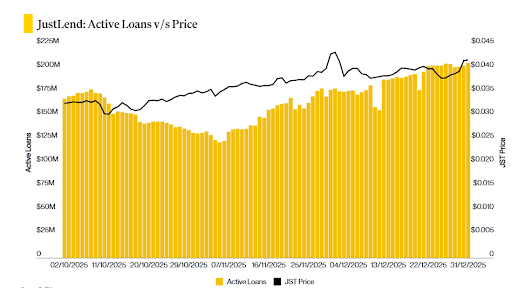 While total value locked on Tron fell from $6 billion to $4.5 billion during Q4, lending remained strong. JustLend, the network's biggest lending protocol, held $3.9 billion in TVL and saw active loans rise from $168 million to $206 million.