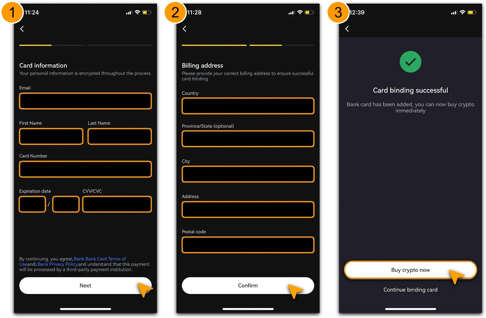 Upon successful verification, you’ll see a「Card Binding Successful」message prompt. Tap「Buy Crypto Now」to proceed with your purchase.